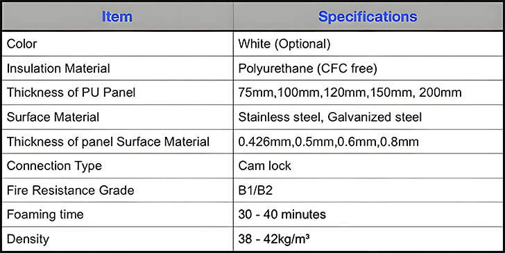 Specifications of PU Panel